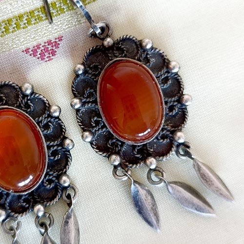 Kolczyki wykonane ze srebra, z dużym owalnym kaboszonem z agatu osadzonym w ornamentalnej oprawie. Ręcznie zdobione układem zawijasów. Dolną część zdobią ruchome elementy, przypominające liście lub piórka, i tak samo lekko poruszające się wrac z Tobą.