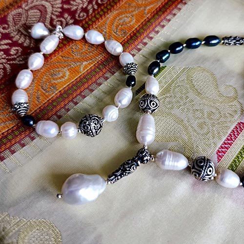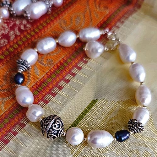 Bransoletka z białych pereł, czarnych pereł i etnicznego srebra.