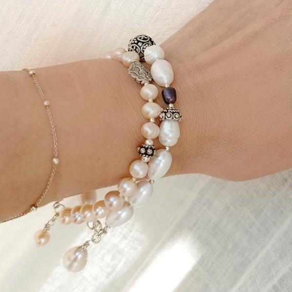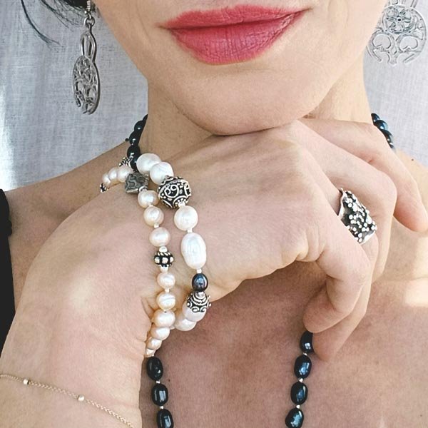 Srebro, bogato zdobione orientalnymi detalami, dodaje delikatnym perłom charakteru. To elementy przywiezione z podróży, z Kairu, zmieniają klasyczne, eleganckie perły w biżuterię w stylu etno boho.