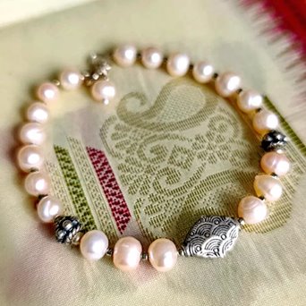 Bransoletka ozdobiona i wykończona srebrem. Przy zapięciu zawieszka z perłą. Jedyny egzemplarz!