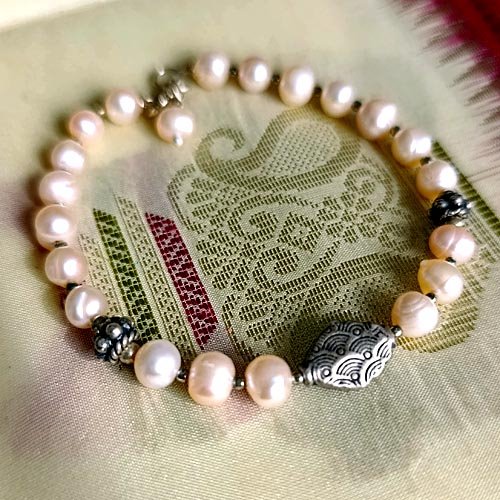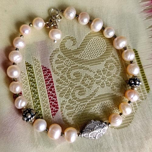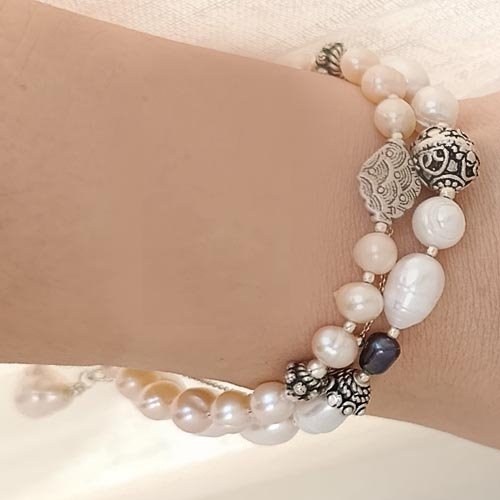 Delikatne boho. Ponadczasowe piękno w etnicznym wydaniu. Szlachetność naturalnych pereł słodkowodnych w odcieniu złamanej bieli (ecru) z bogato zdobionymi elementami ze srebra przywiezionymi z Egiptu.