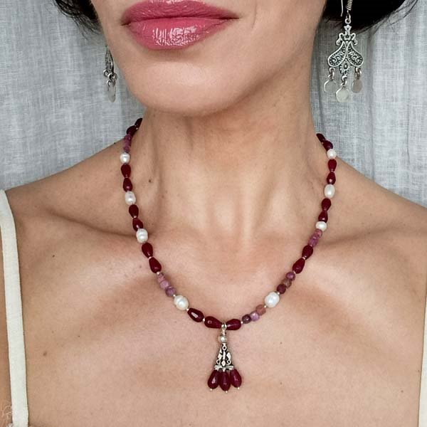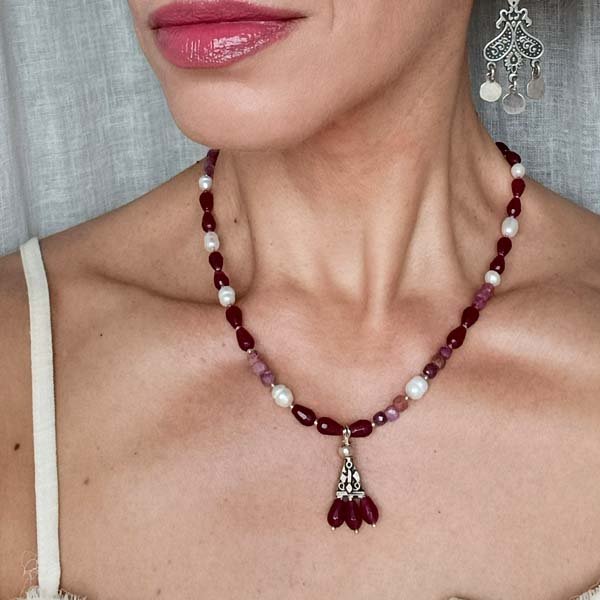 Naszyjnik z różowego jadeitu, rodonitu i naturalnych pereł, ozdobiony srebrem.