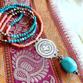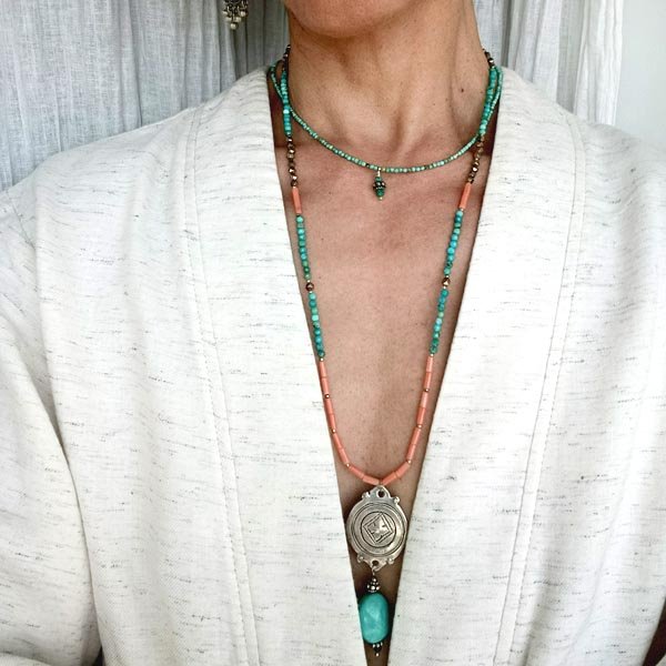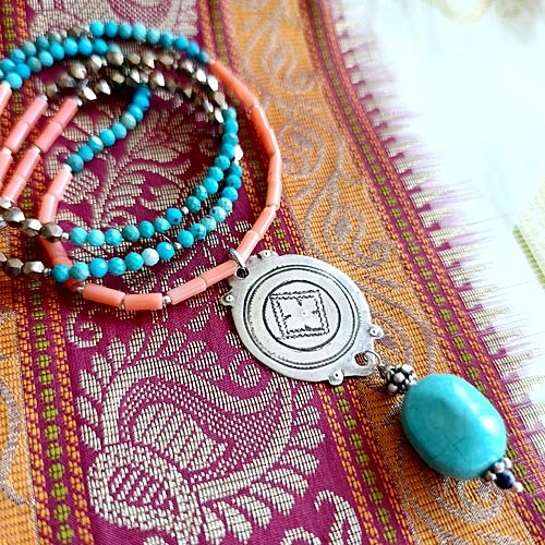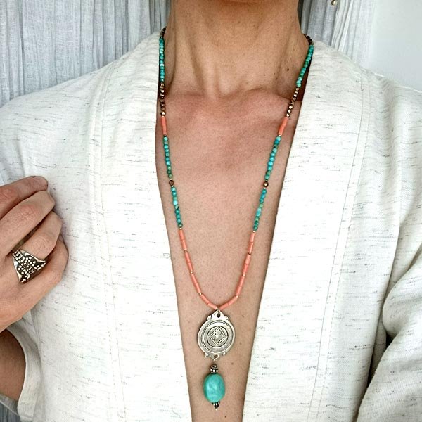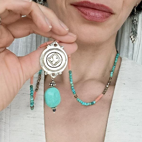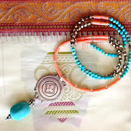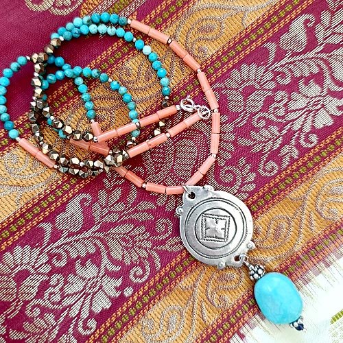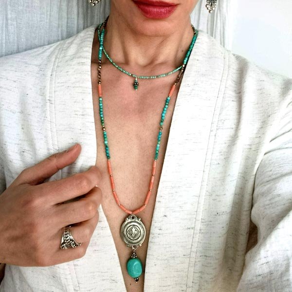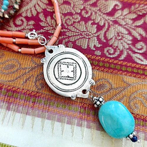 Kamienie dobrałam tak, jak dobierałyby je berberyjskie kobiety: koral, turkus i metal w jednym sznurze — trzy żywioły, jeden naszyjnik.