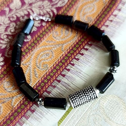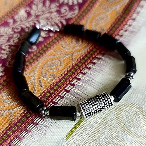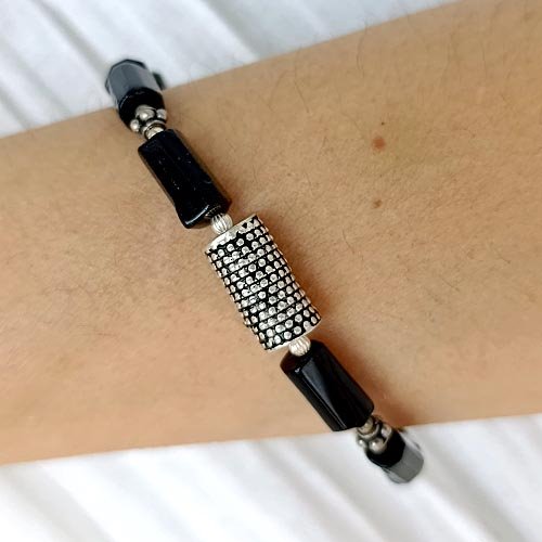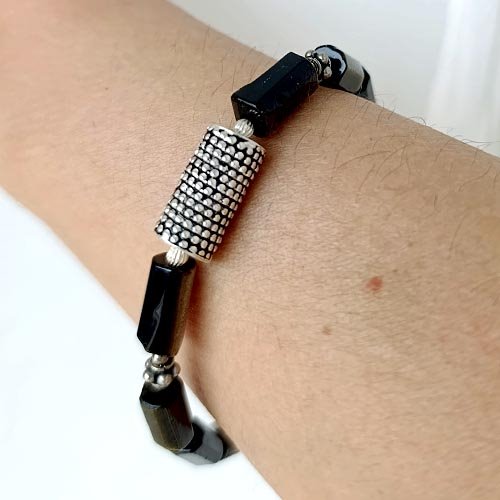 Gęsta czerń obsydianu i surowy chłód srebra. Męska bransoletka.